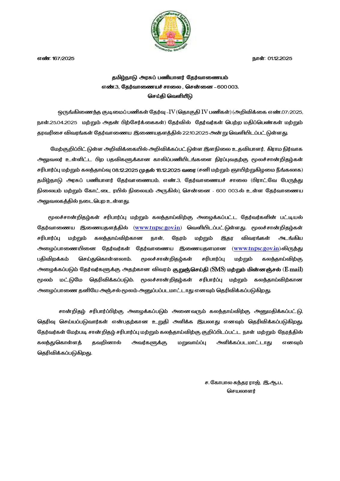 மேற்குறிப்பிட்டுள்ள அறிவிக்கையில் அறிவிக்கப்பட்டுள்ள இளநிலை உதவியாளர் கிராம நிர்வாக அலுவார் உள்ளிட்ட பிற புதவிகளுக்கான காலிப்பணியிடங்களை நிரப்புவதற்கு மூலச்சமன்புதடுகள் சரிபார்ப்பு மற்றும் காந்தாப்டி 08:122025 முதல் 8.10.2005 வரை சனி மற்றும் யிற்றுகிழமை நீங்கலாக) தமிழ்நாடு அராப் பணியாளர் தேர்வாணையம் எண்டு தேர்வாணையர் சாலை பிராட்வே பேருத்து நிலையம் மற்றும் கோட்டையில் நிலையம் அருகில்) சென்னை 005ல் உள்ள தேர்வாணைய அலுவலகத்தில் நடைபுெறஉள்ளது. மூலச்சான்றிதழ்கள் சரிபார்ப்பு மற்றும் கலத்தூய்விற்கு அழைக்கப்பட்ட தேர்வர்களின் பட்டியல் தேர்வாணைய இணையதளத்தில் மquin)வளியிடப்பட்டுள்ளது. தூலச்சான்றிதழ்கள் சரிபார்ப்பு மற்றும் கலந்தாய்விற்கான நாள், நேரம் மற்றும் ae அடர்மிய அழைப்பாணையினை தேர்வர்கள் வாணைய இணைRலிருத்து பதிவிறக்கம் செய்துகொள்ளலாமூலச்கள் சரிப்பு மற்றும் கலந்தாய்விற்கு அழைக்கப்படும் தேர்வர்களுக்கு அதற்கான விவரம் குறுஞ்செய்தி (SMS) மற்றும் மின்னஞ்சல் (E wi மூலம் மட்டுமே தெரிவிக்கப்படும் மூலச்சான்றிதழ்கள் சபாரிப்பு மற்றும் கலந்தாய்விற்கான அழைப்பாணை தனியே அஞ்சல் மூலம் அனுப்பப்படமாட்டாது எனவும் தெரிவிக்கப்படுகிறது.