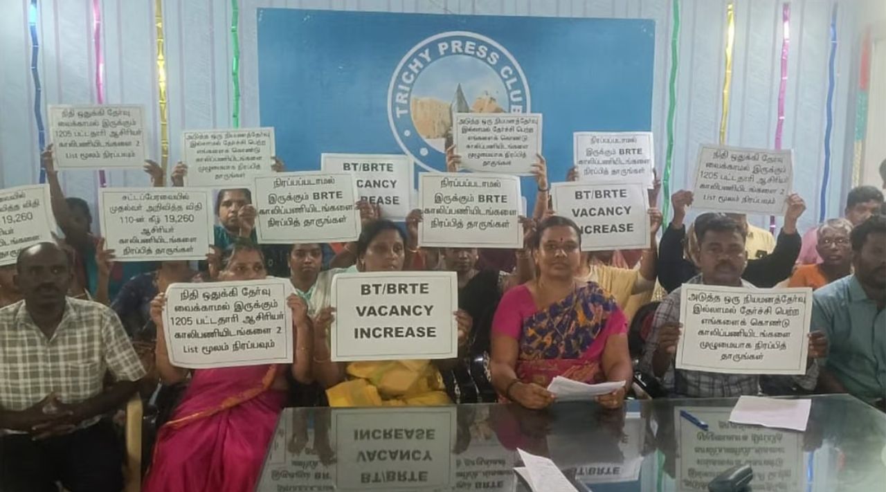 கடந்த 2023-ஆம் ஆண்டு நடத்தப்பட்ட ஆசிரியர் நியமனத் தேர்வில் தேர்ச்சி பெற்று, பணி வாய்ப்புக்காகக் காத்திருக்கும் ஆயிரக்கணக்கான ஆசிரியர்கள், தங்களுக்கு மறு நியமனத் தேர்வு இல்லாமல் நேரடியாகப் பணி வழங்க வேண்டும் எனத் தமிழக அரசுக்குக் கோரிக்கை விடுத்து உள்ளனர். திருச்சியில் இன்று செய்தியாளர்களைச் சந்தித்த ஒருங்கிணைப்பாளர்கள் எம்.கலைவாணி, எம்.மோகன்ராஜ் மற்றும் எஸ்.பாஸ்கர் ஆகியோர் முன்வைத்த கோரிக்கைகள் பின்வருமாறு: 2023-ஆம் ஆண்டு நடைபெற்ற பட்டதாரி ஆசிரியர் (BT) மற்றும் வட்டார வள மைய ஆசிரியர் பயிற்றுநர் (BRTE) நியமனத் தேர்வில் மொத்தம் 37,000 பேர் தேர்ச்சி பெற்றனர். அறிவிக்கப்பட்ட 3,192 காலிப்பணியிடங்களில், 2,800 இடங்கள் மட்டுமே நிரப்பப்பட்டுள்ளன. மீதமுள்ள 392 இடங்களுக்கான இரண்டாவது பட்டியலை அரசு வெளியிடவில்லை. கடந்த 15 ஆண்டுகளாக 726 ஆசிரியர் பயிற்றுநர் (BRTE) பணியிடங்கள் நிரப்பப்படாமல் காலியாகவே உள்ளன. ஆசிரியர் தேர்வு வாரியம் (TRB) மார்ச் மாதம் 1,205 பணியிடங்களுக்காக மீண்டும் ஒரு நியமனத் தேர்வு நடத்தத் திட்டமிட்டுள்ளது. இதற்கு கடும் எதிர்ப்புத் தெரிவித்துள்ள ஆசிரியர்கள், "ஏற்கனவே தகுதித் தேர்வு (TET), தமிழ் தகுதித் தேர்வு மற்றும் 2023 நியமனத் தேர்வு என அனைத்திலும் தேர்ச்சி பெற்று 34,200 பேர் காத்திருக்கிறோம். அப்படியிருக்கையில் மீண்டும் எதற்காகத் தேர்வு நடத்த வேண்டும்?" என்று கேள்வி எழுப்பி உள்ளனர்.